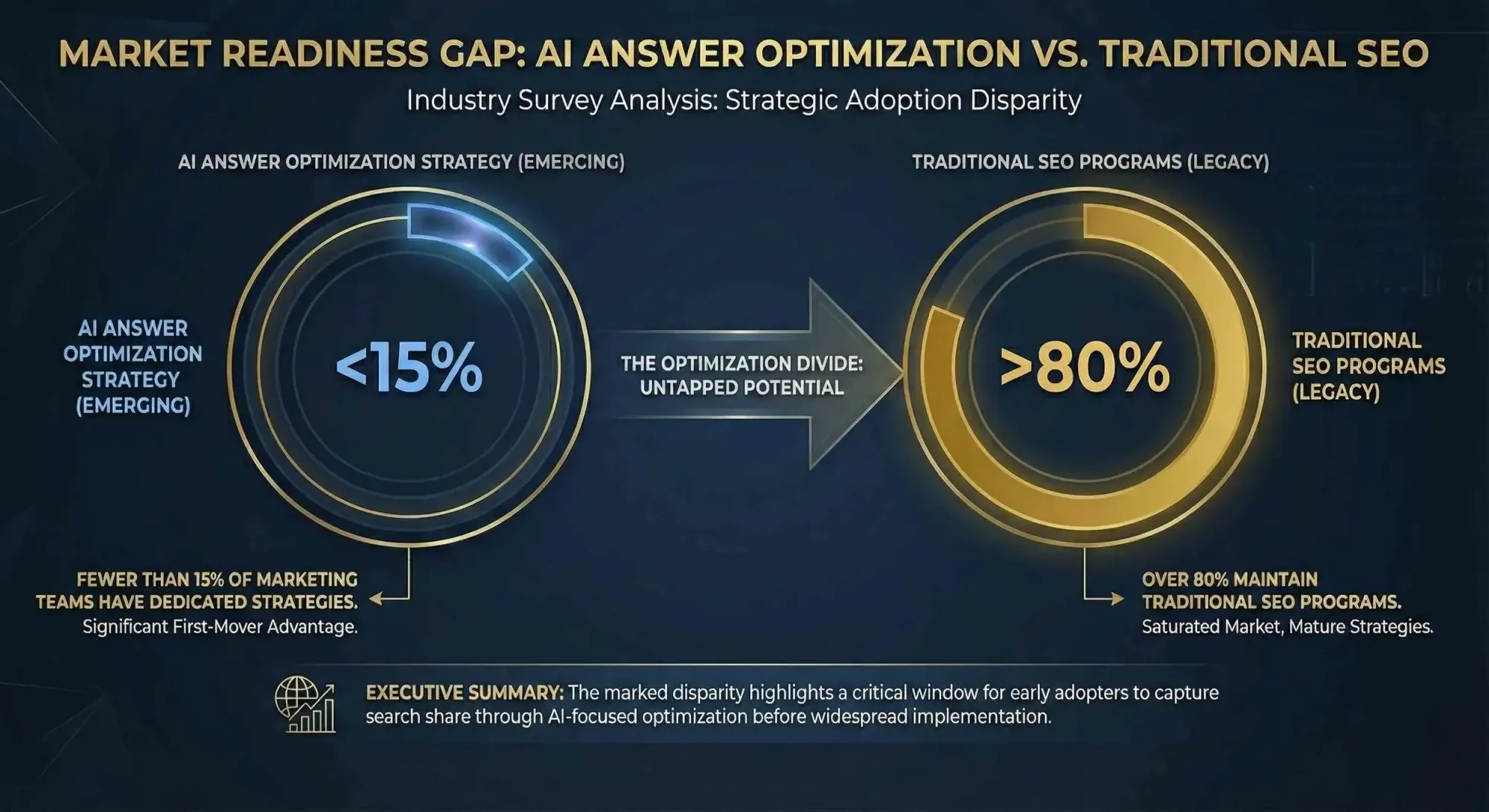 Industry surveys suggest fewer than 15% of marketing teams currently have dedicated strategies for AI answer optimization, while over 80% maintain traditional SEO programs.