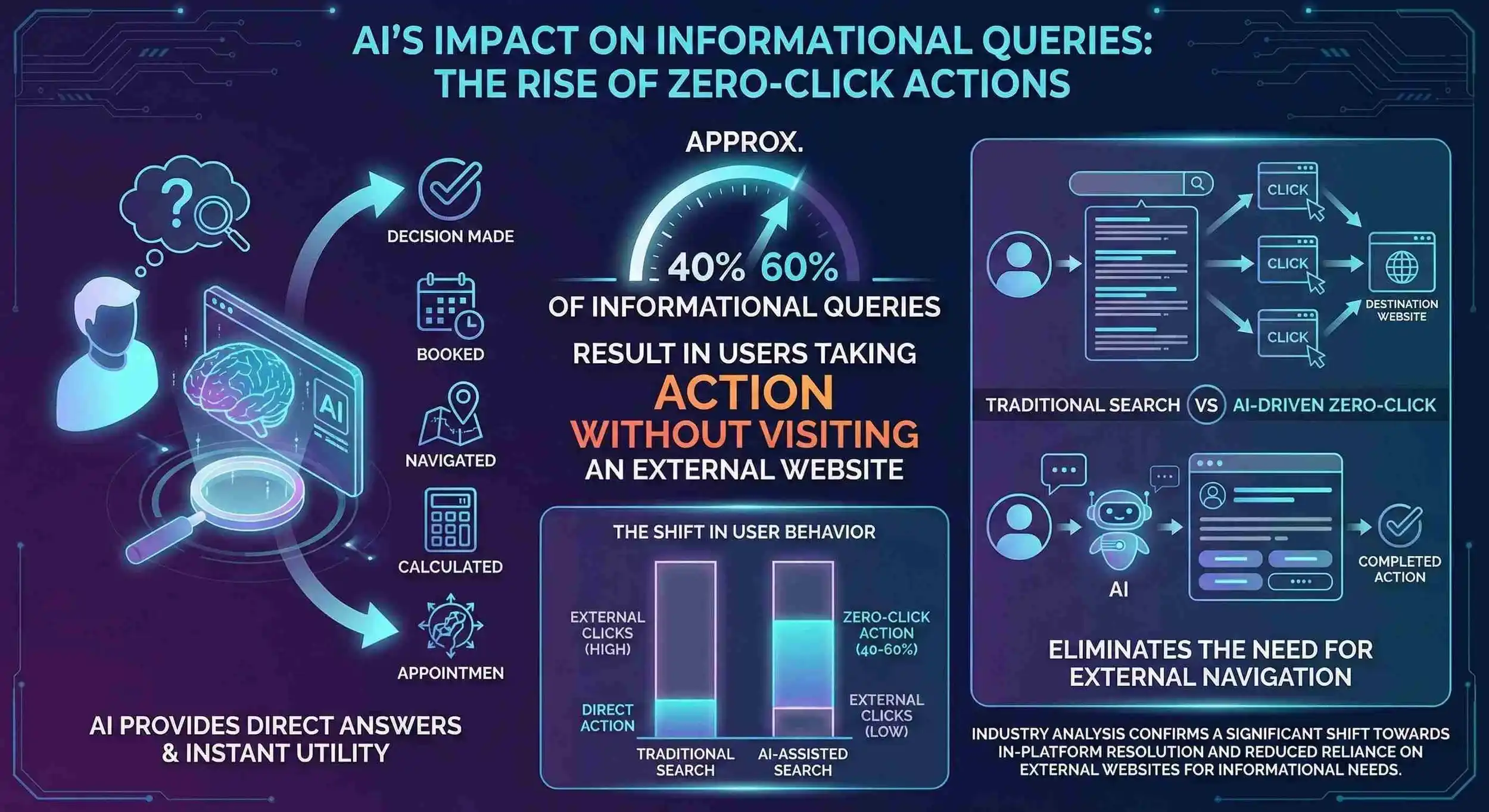 Based on industry analysis of AI platform usage patterns, approximately 40-60% of informational queries to major AI assistants result in users taking action without visiting any external website.