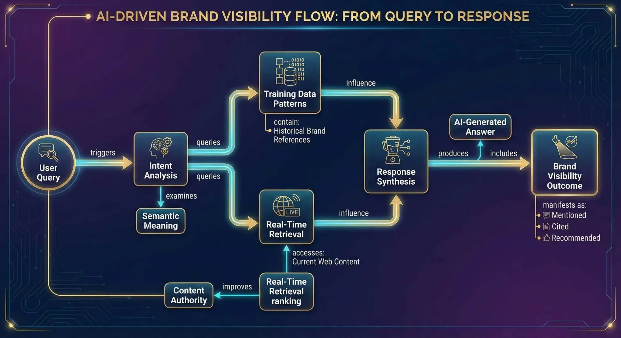 AI systems assemble answers from training data patterns and retrieved web content, prioritizing sources that demonstrate authority, recency, and contextual relevance. Unlike keyword-based search engines, large language models identify semantic intent behind queries, retrieve relevant information from training data and real-time sources, then synthesize responses addressing that intent.